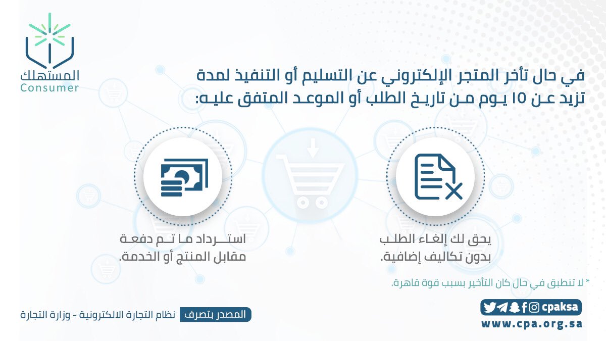 جمعية حماية المستهلك A Twitter من حق المستهلك إلغاء الطلب إذا تأخر المتجر عن التسليم لأكثر من 15 يوم عن الموعد المتفق للتسليم أو من تاريخ الطلب في حال لم يحدد موعد