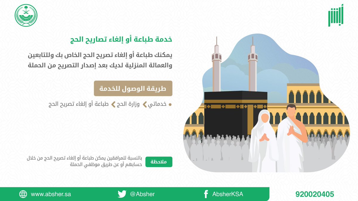 أبشر On Twitter خدمة طباعة أو إلغاء تصاريح الحج عبر منصة أبشر Https T Co Snpbew6yzq ملاحظة يمكن إلغاء تصريح الحج إلكترونيا قبل تاريخ 7 12 1440 هـ حج 1440 Https T Co Gjbkeivswn